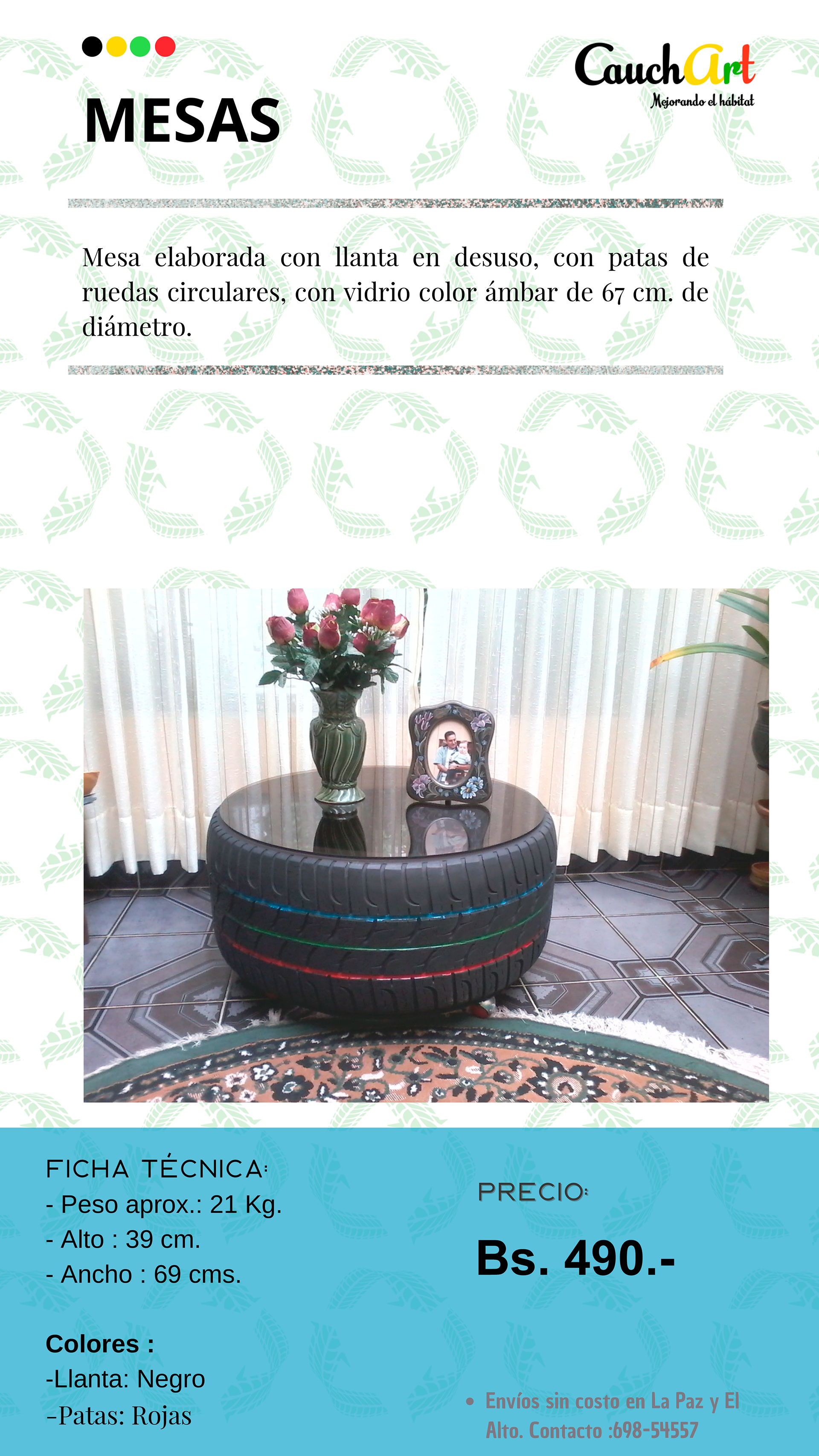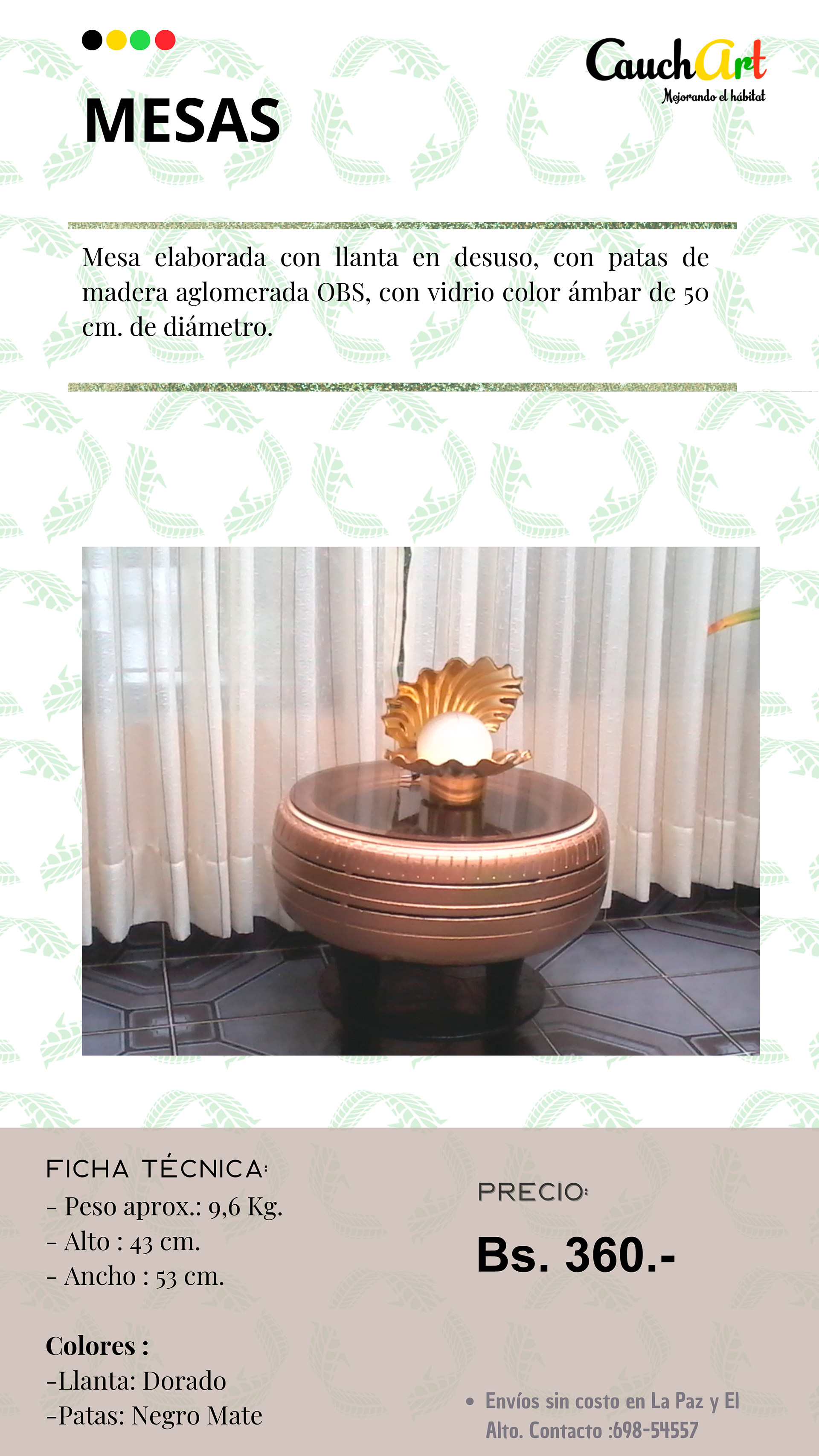 Mesa elaborada finamente con llanta en desuso, pintada con color dorado.